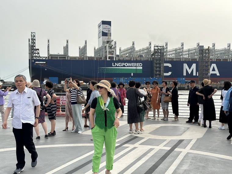 随后,老同志们来到整齐排列、井然有序的江南造船基地船坞平台现场。该基地是目前中国规模最大、设施最先进、生产品种最为广泛的现代化造船基地,能够建造全系列液化气船、超大型集装箱船以及科考船、破冰船等特种船舶。船厂内大型龙门吊林立,巨大的在造集装箱船,一派繁忙景象,大家实地参观了设备实施最完善、技术最先进、造船种类最丰富的现代化工业基地,真切感受了“大国重器”的硬核魅力和发展潜力。