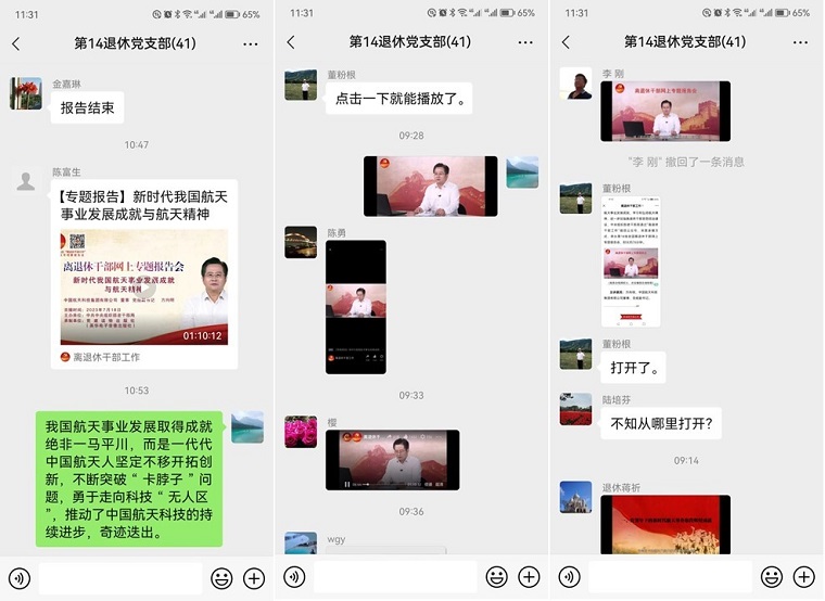 7月18日上午,退休十四支部召开主题教育专题组织生活会,组织党员集体收看由中国航天科技集团有限公司董事、党组副书记方向明作“新时代我国航天事业发展成就与航天精神”专题报告会。支部广大退休党员克服上海连日高温天气,准时在线收听收看了报告会。在报告会后支部组织党员参加讨论,许多党员纷纷发表感想体会和点滴感悟。