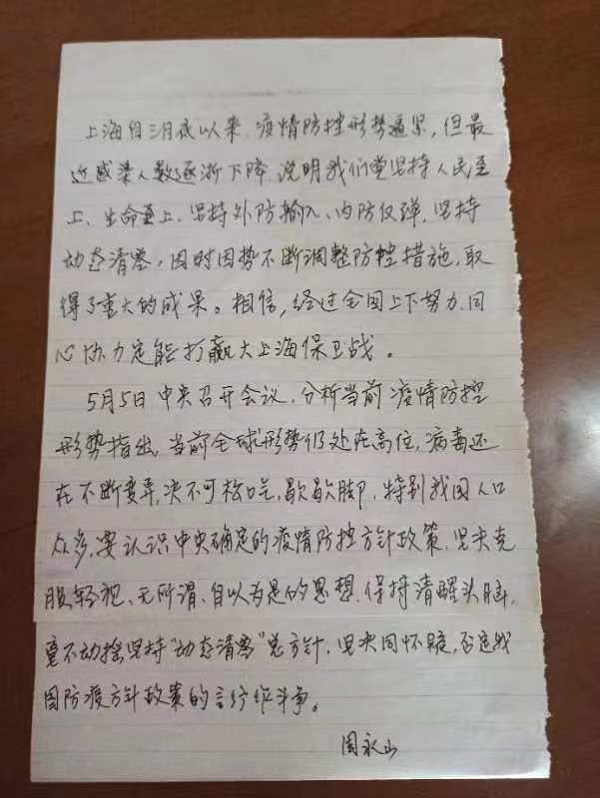 我们退休党员在特殊时期体现应有担当,统一思想认识,坚定必胜信念,携手共度难关。要克服封控已久情绪波动,始终保持良好心态,继续积极配合社区防控措施,进一步做好自身和家人的抗疫防护,保持身体健康,共同打赢大上海保卫战这场战役,一定能够取得最后的伟大胜利!