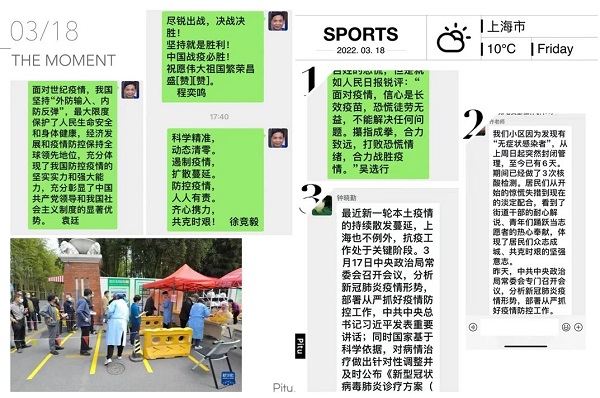 面对这次突如其来的疫情,上海又一次经历着严峻的考验。我觉得我们党员要做的就是在社区的事务中发挥正能量,多做一些积极的事情,用我们的实际行动与新冠作长期的抗争,我坚信,最终的胜利必将属于我们,上海一定能够经受起这次考验。