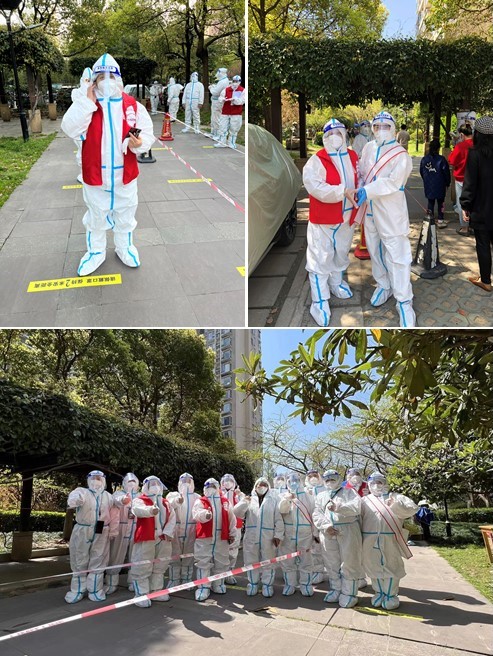 退休五支部党员朱小华于4月1日、5日在杨浦区四平街道和平花苑小区担任志愿者,主要协助医护人员对全小区居民进行核酸检测工作。