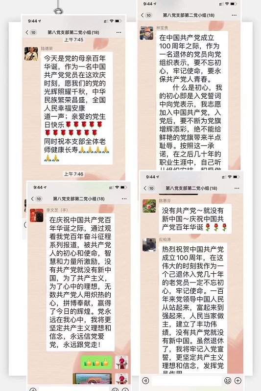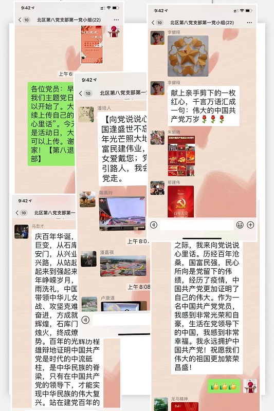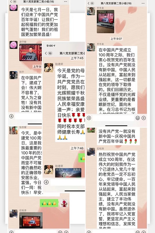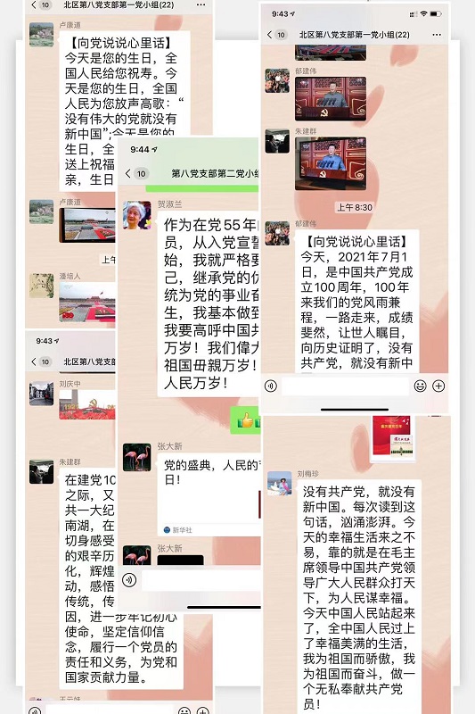 今天是我们党建党百年华诞。第八党支部按计划在今天开展了“向党说说心里话”的微信主题党日活动。主题党日活动以收看党中央庆祝大会,聆听习总书记重要讲话为主要内容,党员们以文字,照片、视频等形式交流体会,在这个特殊的日子,向党说说心里话。主题活动从一早开始,群内气氛热烈,许多党员把早已准备好的“心里话”上传到微信群,交流心得,表达心情。