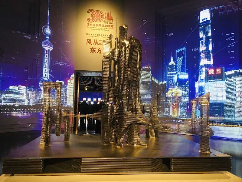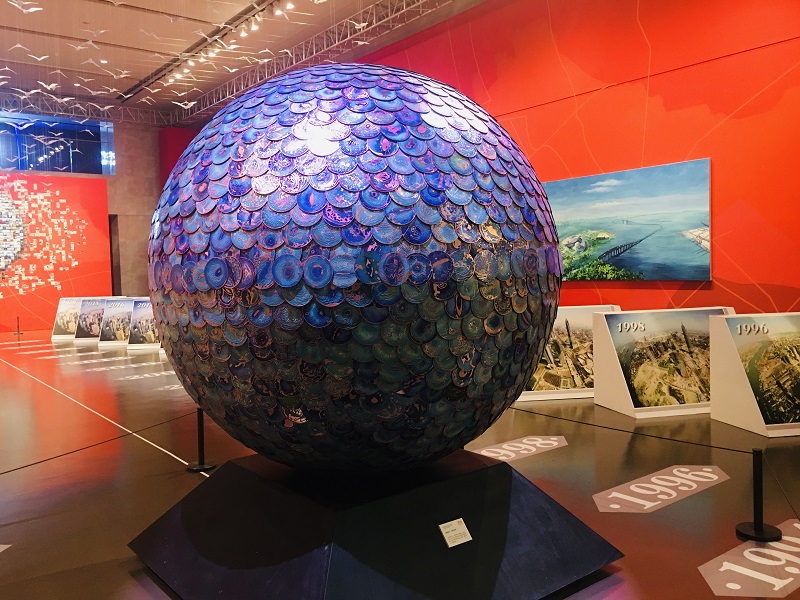 进入展览馆以“改革巨变”为主题的第一展厅,由1990块珐琅铜盘组成的《海纳百川面向世界》雕塑 “地球仪”特别引人注意,这让人们重温1990年“站在地球仪旁思考浦东开发”的初心。顺着先行者敢闯敢试的历史足迹,大家通过时间轴直观感受浦东开发开放的蓬勃动力,领略到浦东30年间的华丽蜕变,以发展的实景展现中国改革开放的浦东故事和浦东传奇。中轴线两侧,一年一张的陆家嘴俯瞰照,见证了浦东一年一个样的风云巨变。正面《30》照片墙上,1210张从民间征集而来的百姓镜头中的浦东印象,汇集了浦东1210平方公里上的艺术慧眼。