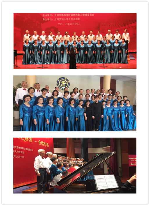 2017年6月7日,我校退休职工合唱团参加了在上海交通大学徐汇校区举办的2017年上海市高校退休教职工合唱专场展演活动。我校以一曲《跟党走》紧扣“唱响时代旋律,共圆中国梦想”展演主题,以饱满的激情表达了老同志们不忘初心、继续前行,迎接党的十九大召开的赤子情怀和永远跟党走的坚定信念,作为七一前夕向党的生日的真诚献礼。