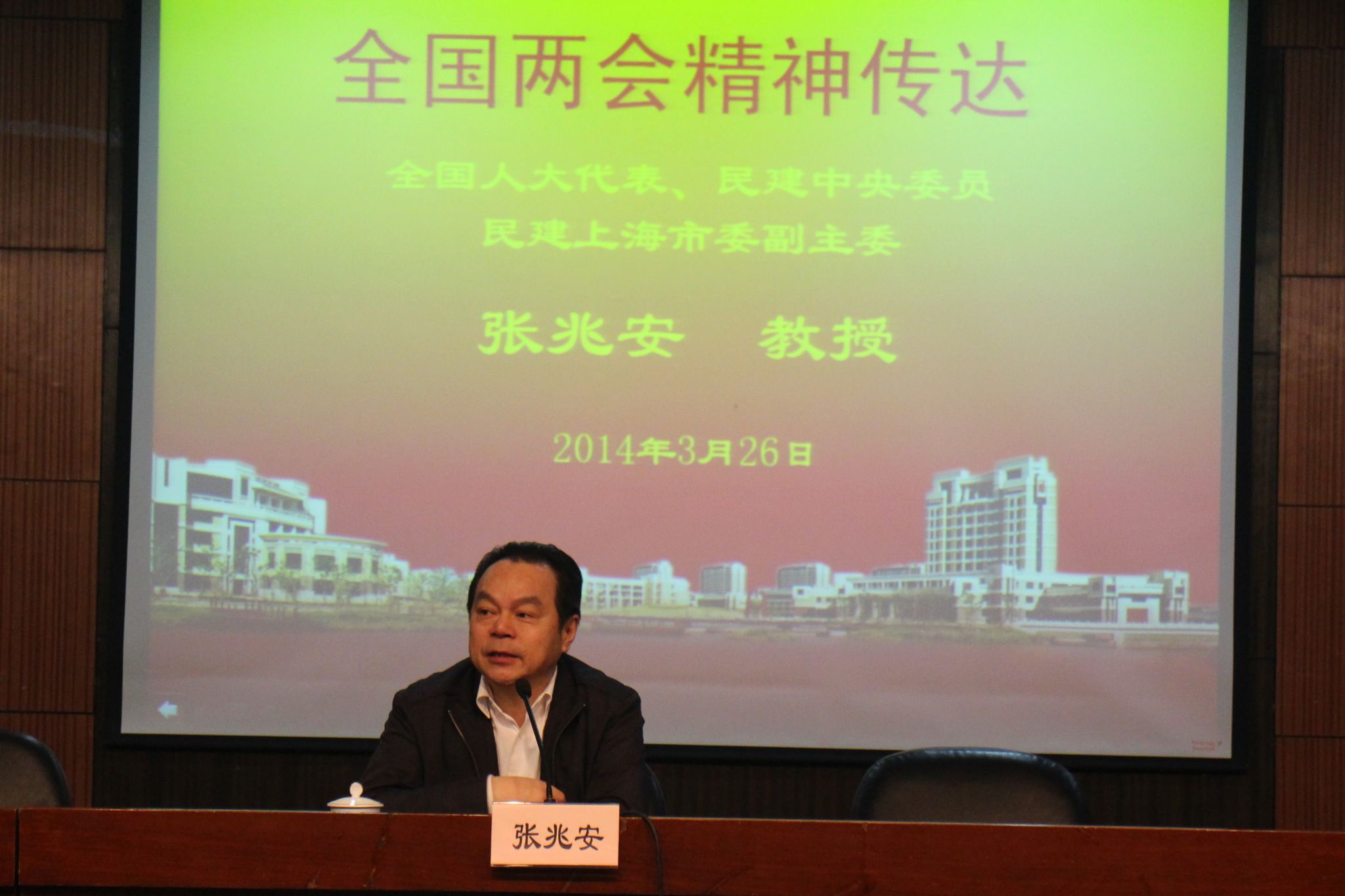 2014年3月26日上午,离退休党总支邀请全国人大代表、中国民主建国会中央委员、民建上海市委专职副主委经济学博士张兆安教授来校给离退休党员作学习全国“两会”精神辅导报告。