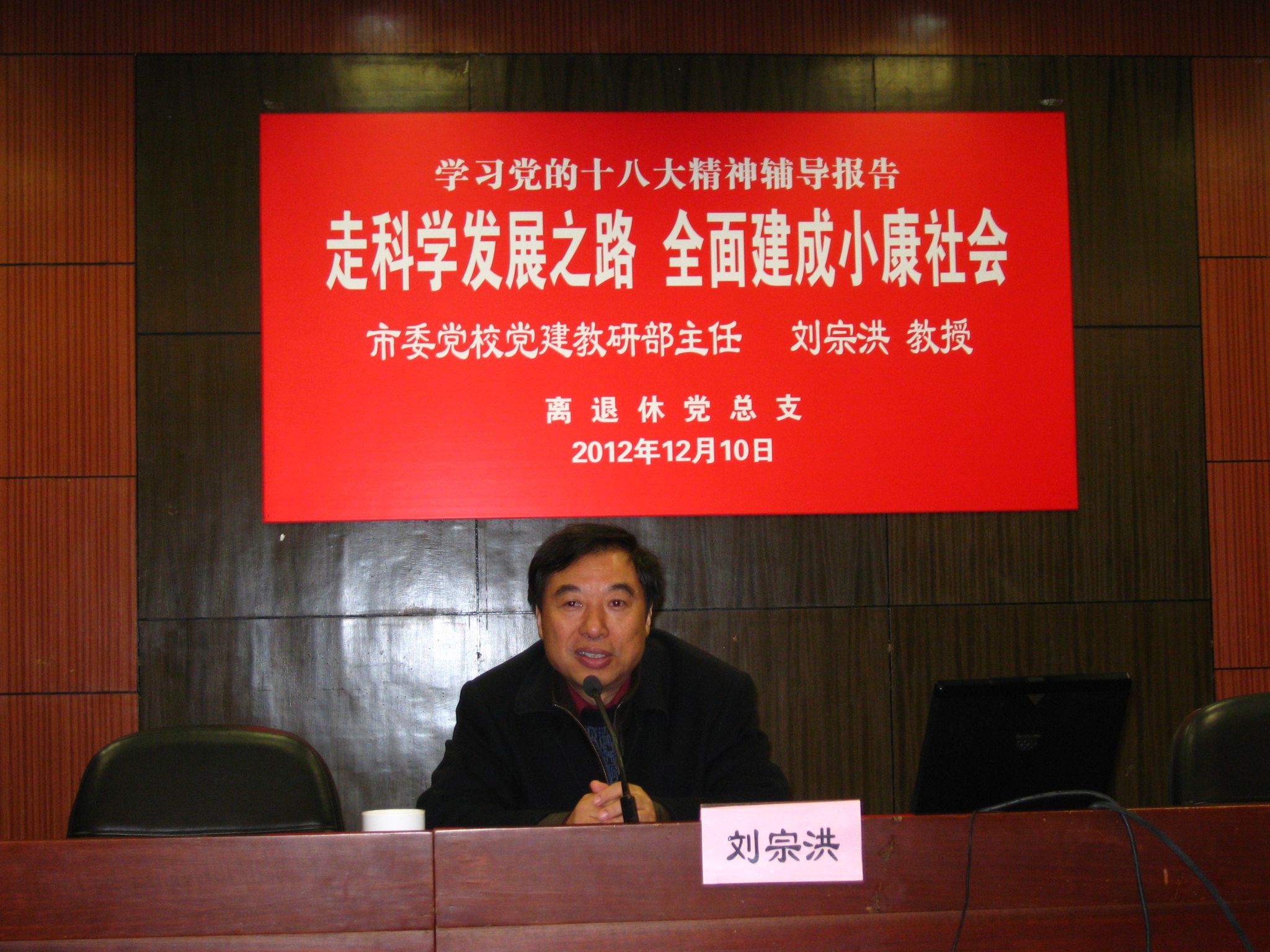 整场辅导报告用时近两小时,刘刘宗洪教授以其扎实的理论功底,生动诙谐的语言,深入浅出地为离退休党员进行了辅导,特别从四个方面:一、落后大国和平崛起的历史经验;二、倍加珍惜,始终坚持,不断发展中国特色社会主义;三、中国特色社会主义的新目标——建成小康社会;四、建成小康社会的整体布局;解读了党的十八大精神,内容翔实生动,对离退休党总支及全体党员下阶段进一步学习贯彻十八大精神具有积极的指导意义。
