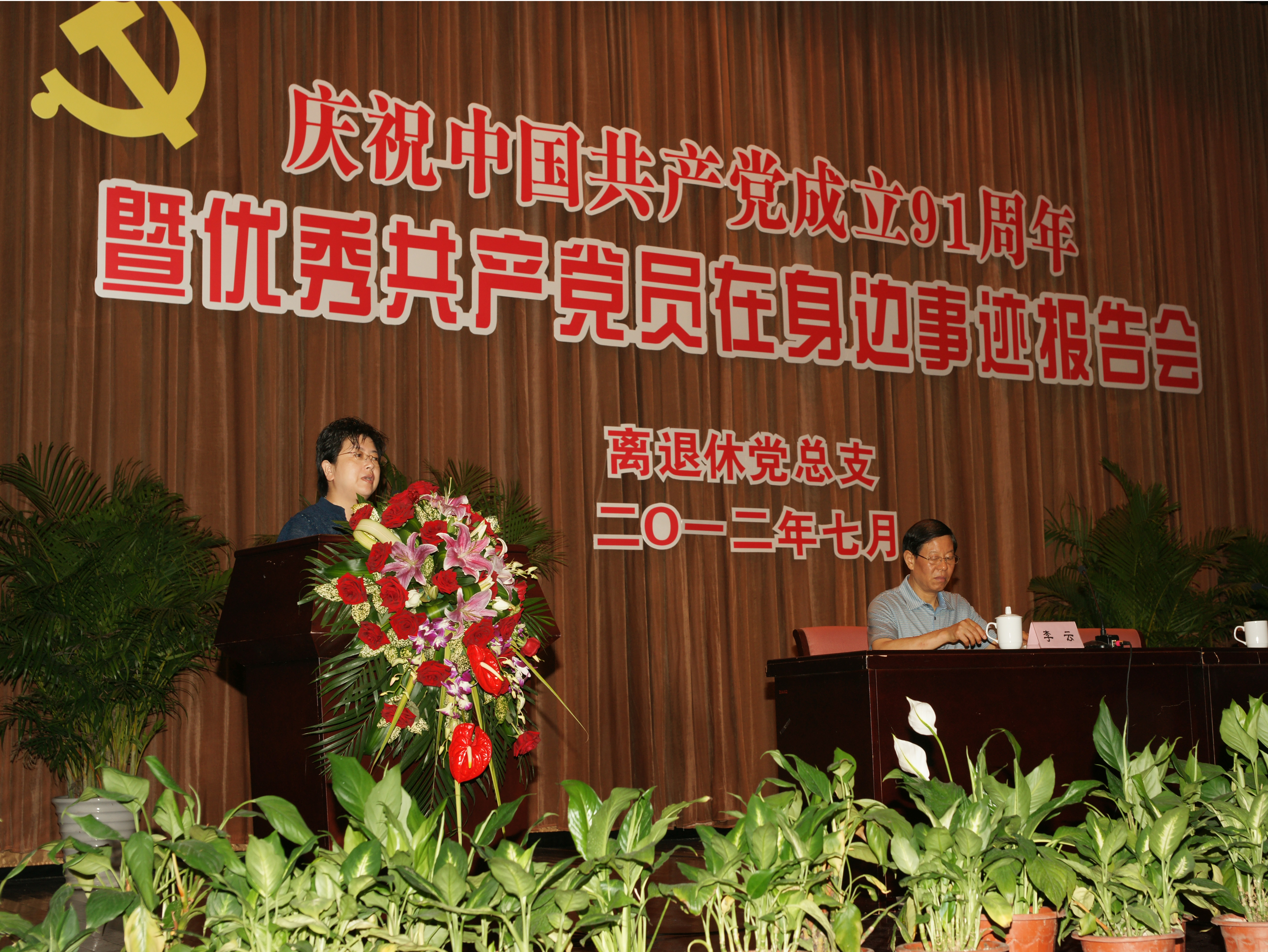 2012年7月3日上午,离退休党总支在徐汇校区大礼堂举行庆祝中国共产党成立91周年暨“优秀共产党员在身边”事迹报告会。大会在雄壮嘹亮的中华人民共和国国歌声中开幕。离退休300多位党员出席会议,党委副书记宋敏娟同志到会并讲话。