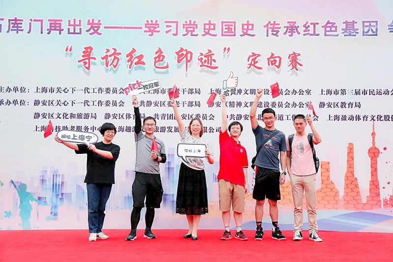 启动仪式后,2020年度“从石库门再出发——学习党史国史、传承红色基因、争做时代新人”主题系列活动之一的“寻访红色印迹”定向赛,在由8个炮弹孔、430个大小枪弹孔组成的四行仓库抗战纪念墙下宣布开赛。作为上海市关工委各成员单位组建的35支队伍之一的教卫工作党委关工委“阳光追梦”队,由我校关工委老同志代表黄燕、青年教师代表王云杰、谢晴和城建学院青年学生宋雨晴、赵定章共同组队而成,在蔡亚鸣老师绘制的队旗指引下,团队成员冒着蒙蒙细雨,精神抖擞地在步行和乘坐公共交通工具之间灵活切换,从四行仓库抗战纪念馆晋元纪念广场一路出发,在结对重走中共二大会址纪念馆、中国劳动组合书记部旧址陈列馆、上海毛泽东旧居陈列馆等红色建筑中,近距离感受党史的深厚底蕴,在恒隆广场“白领驿家”党群服务站的人文关怀氛围中,领略人民城市和社会文化发展的速度。在返回晋元纪念广场的途中,团队成员纷纷表示:很高兴参加这次城市定向赛活动,在趣味赛中重温党的奋斗历程、激发爱党爱国情怀,自己很有收获。通过集体完成系列“点位”打卡任务,可以在光辉的党史教育中不断汲取继承革命传统和赓续红色基因的前行力量,也坚定了砥砺初心走好新时代长征路的信心和决心。