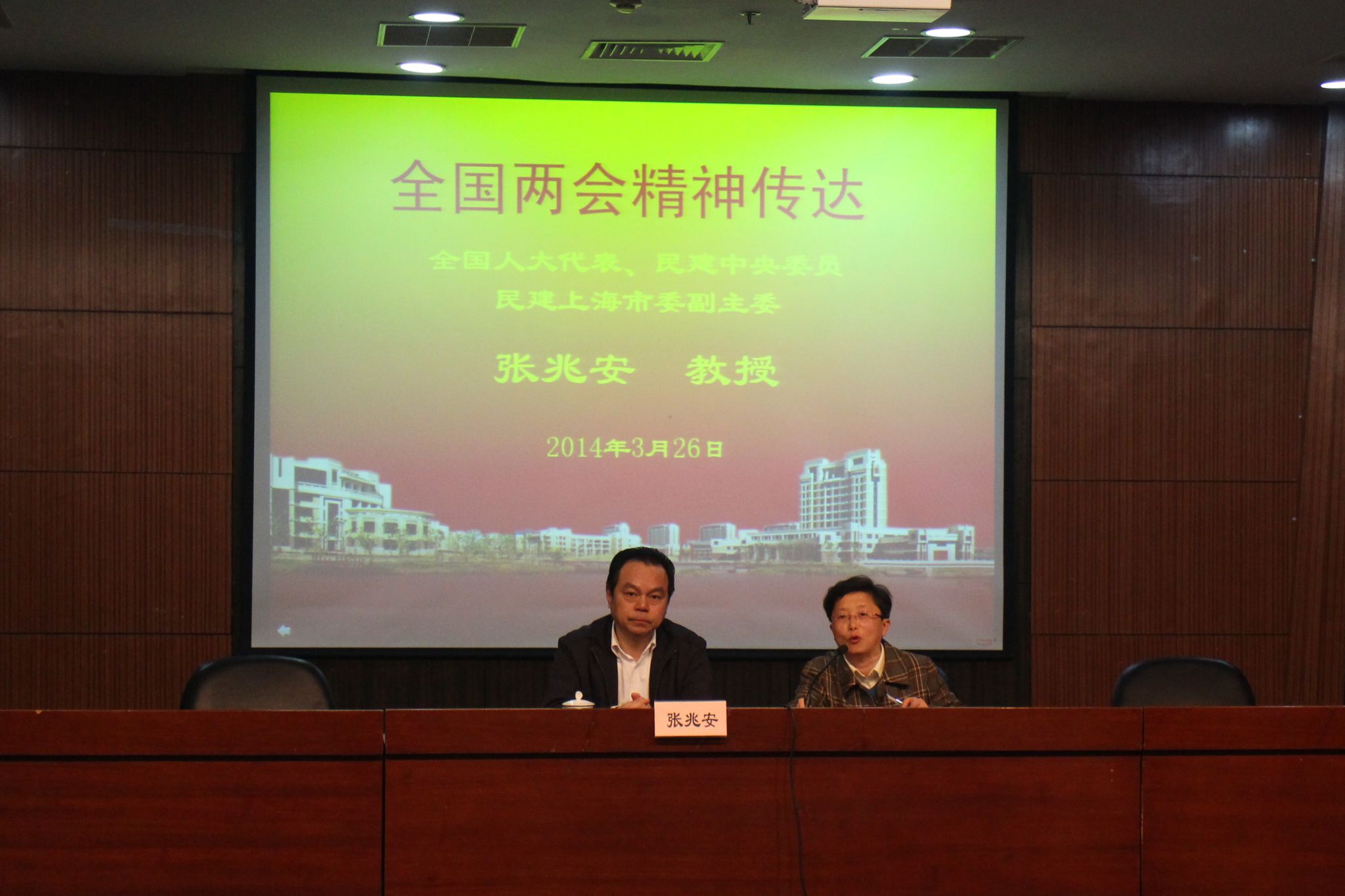 2014年3月26日上午,离退休党总支邀请全国人大代表、中国民主建国会中央委员、民建上海市委专职副主委经济学博士张兆安教授来校给离退休党员作学习全国“两会”精神辅导报告。