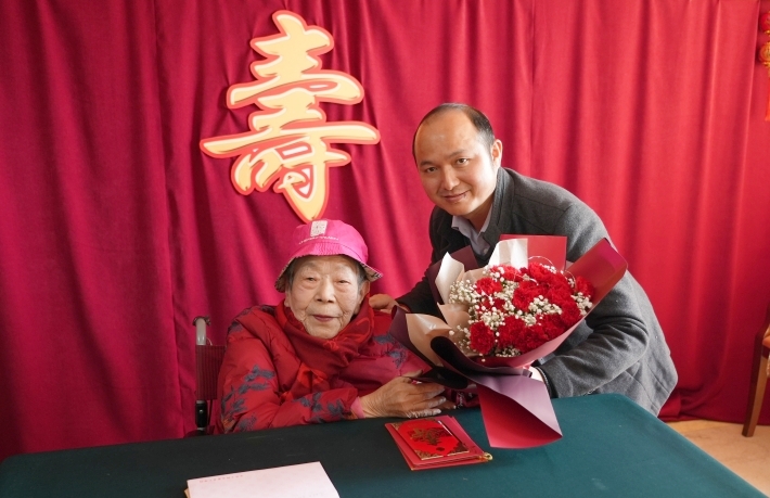 现场气氛热烈欢快。祝尔纯亲属感谢学校对老人的关心和照顾。我校“忠诠-尔纯思想政治教育奖”获奖教师和学生代表向祝老赠送鲜花,衷心祝愿老人福寿绵长、幸福安康。