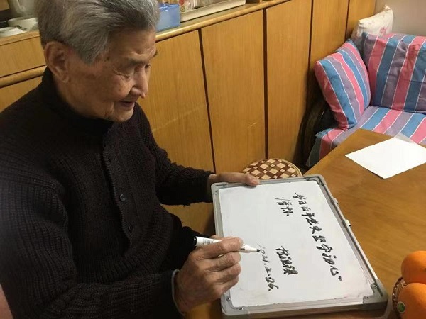 我校百岁离休干部林祖祺同志在听闻老干部工作者传达的总书记重要回信精神时非常激动,虽然听力有限只能依靠小黑板进行交流,他还是欣然写下了“学习百年党史 坚守初心情怀”,表达了自己初心不改、始终不渝的信仰追求。
