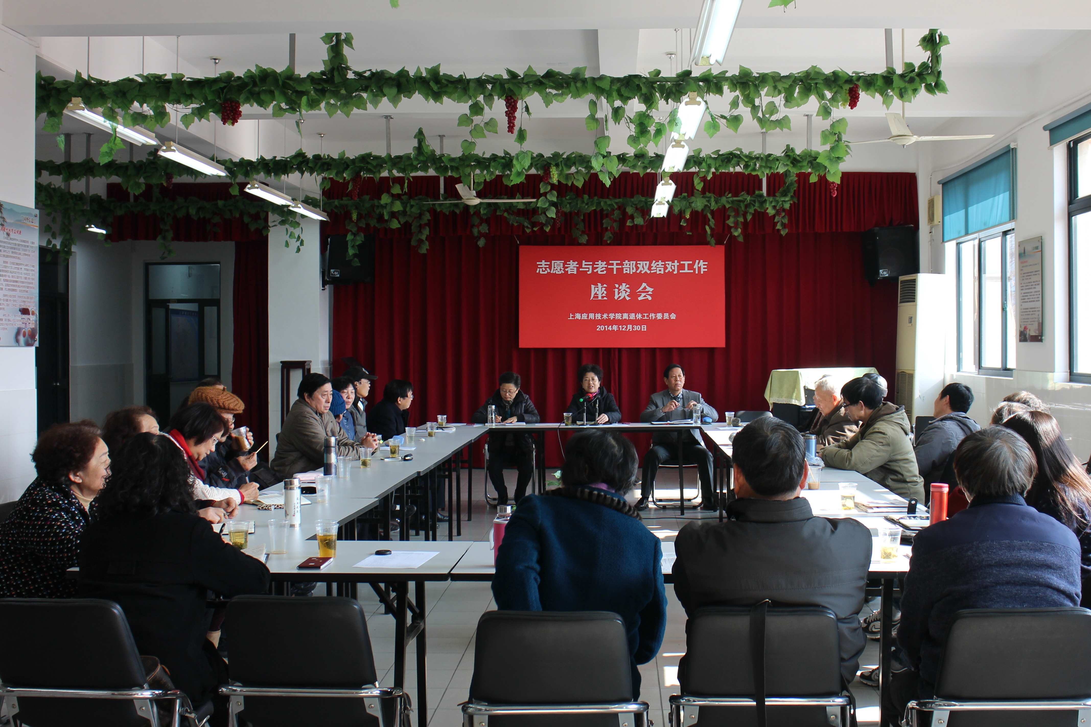 2014年12月30日上午,学校在徐汇校区召开了2014年度志愿者与老干部双结对工作座谈会。党委副书记、纪委书记宋敏娟到会并讲话。我校离休干部代表、退休党支部书记、全体志愿者、田林社区老干部科干部及志愿者代表和离退休工作委员会负责人等出席座谈会,