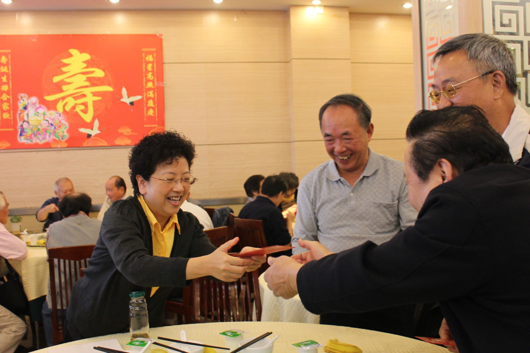 宋敏娟亲手给每一位寿星送上生日慰问红包,她还向大家介绍了学校的发展情况。老同志对宋书记的真诚祝贺及情况介绍报以热烈的掌声。