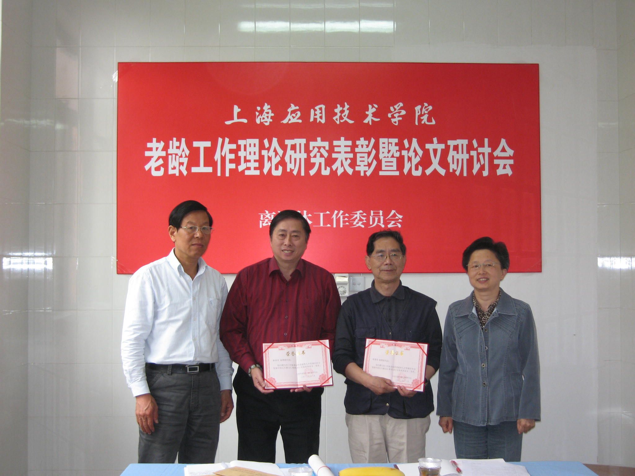 会上对我校2011年度老龄理论研究工作论文获奖者进行了表彰与奖励。其中:蒋秉章、赵增綬撰写的《开拓知识型退休人才资源在社会发展中的巨大潜力》论文获得2011年度上海市退管理论研究二等奖;李正明撰写的《“走”出健康“走”出快乐》、蔡云升撰写的《老年人的科学膳食——促进健康、延年益寿》和邓安华撰写的《浅谈退休综合症及其应对》三篇论文同获2011年度上海市退管理论研究鼓励奖;我校退管工作还获得了2011年度上海市高校退管系统理论研究工作“组织奖”。